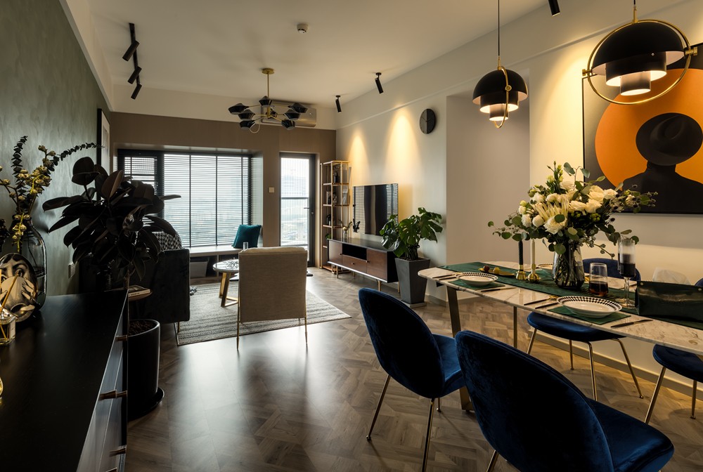復(fù)古混搭風(fēng)格室內(nèi)家裝設(shè)計(jì),客廳色彩追求時(shí)尚且協(xié)調(diào),大理石搭配金色元素組合的圓茶幾和北歐風(fēng)地毯相結(jié)合,在整體風(fēng)格中減輕了色彩飽和度,視覺(jué)空間隨之延伸。
