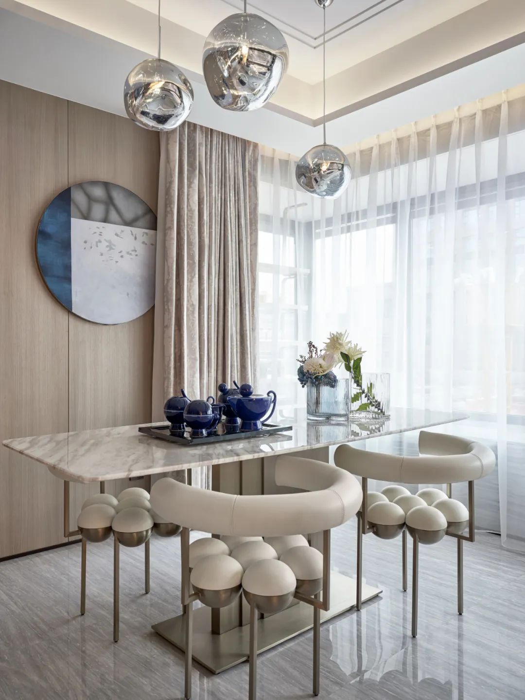餐廳空間最大程度的地引用了客廳的自然光線,從早餐開始便與陽光相伴,使空間整體通透敞亮大氣嚴(yán)謹(jǐn)。