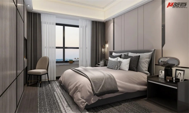 房間同樣采用木色與高級灰的主調(diào),由內(nèi)而外輕松感將一天的疲憊驅(qū)離,灰色的家紡增添了室內(nèi)的祥寧感覺。最適宜的時光莫過于放下一整天的疲倦,這樣讓你很好地安慰疲憊的身心。