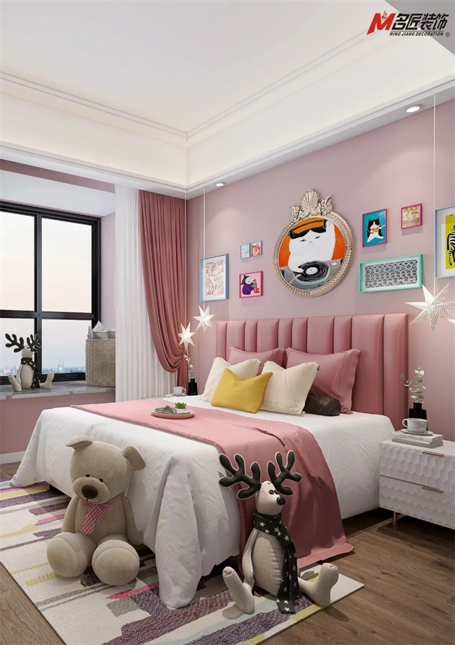 兒童房間以粉色和白色相互交融,這樣溫馨的童心未泯,屬于童真純潔的空間。暖心的床品,溫馨的星星燈可以守護你每一個晚上的美夢。