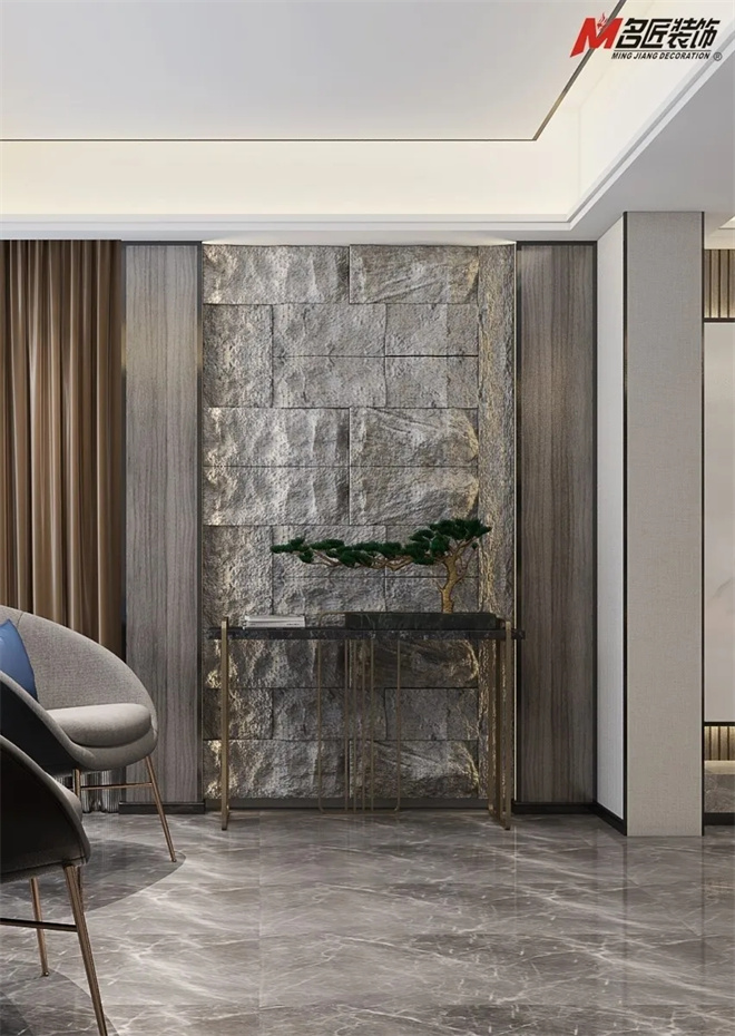 玄關(guān)的原石背景,一抹綠色盎然,作為進門過渡區(qū),承上啟下,需要兼?zhèn)鋵嵱门c美觀的雙重功能。