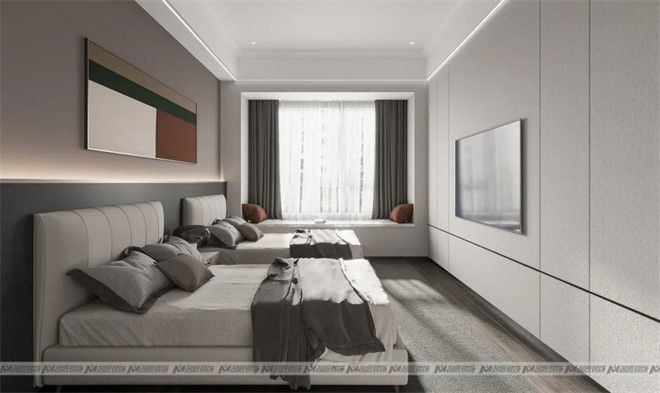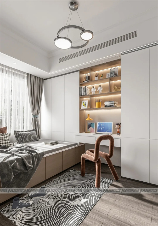 兒童房采用現(xiàn)代化的榻榻米+書桌+衣柜的一體化多功能設計,既能滿足孩子休息、學習、娛樂及收納的基本要求,又保持了整體風格的一致,美觀實用。