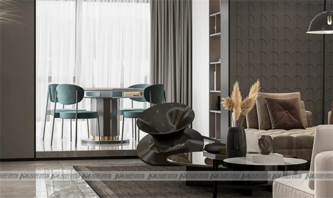 別具一格的客廳設計,突破以往設計的傳統(tǒng)界限,構(gòu)筑了一個大方而獨特的空間。沙發(fā)背景墻采用帶有立體感的深灰色硬包拼接白色墻面,咖色絲絨沙發(fā)拼接白色布藝沙發(fā)與之銜接,在不同材質(zhì)的碰撞下,明與暗的對比下,達到空間錯落有致的視覺感以及層次感。壁爐里的熊熊火焰,讓身心與視覺融起暖意。想象在寒冷的冬日里,在火光的映照下,與家人看一部電影,聽時光緩慢流淌的聲音,這該是多么享受的事情。