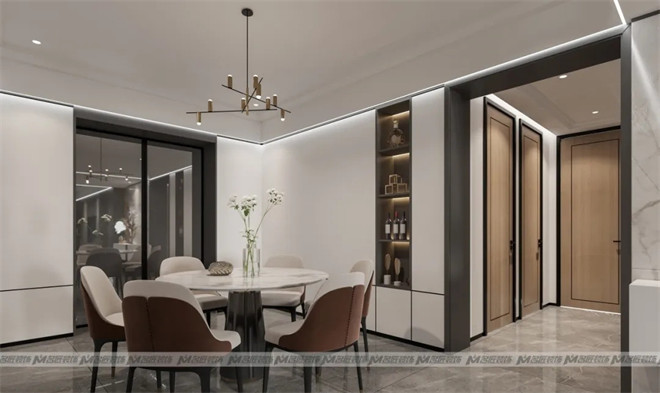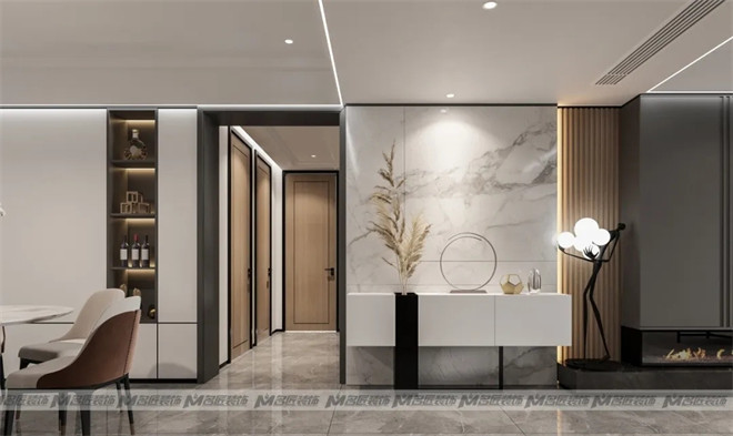 設計師巧妙的布置一組白色的玄關(guān)柜,擺上極具藝術(shù)感與美感的現(xiàn)代擺件作為裝飾,金銀交匯,空間精致感迎面而來,讓人迫不及待地想入室一探究竟!