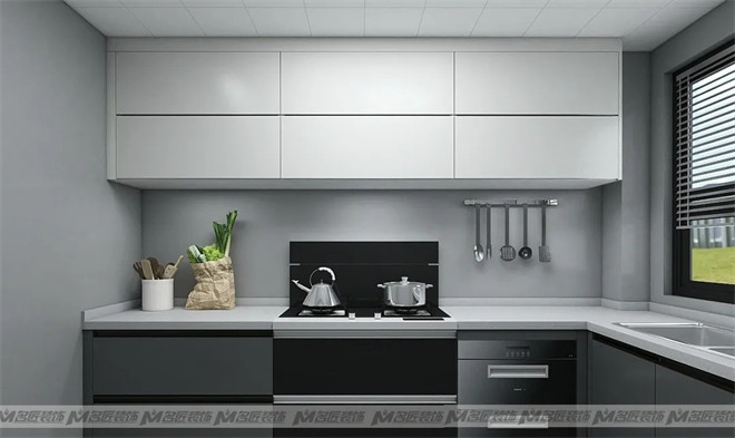 廚房內(nèi)部做了L字型的布局方案,讓廚房擁有更多的儲物空間,功能分區(qū)有所側(cè)重,比較靈活多變。白色吊柜與深灰色櫥柜承上啟下,延續(xù)空間深淺搭配的風格,不顯單一枯燥。