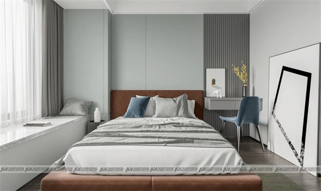 次臥的設計顯得素雅干凈,淺綠色的床背景點亮我們的視線,在感官上追求自然與靜謐,體驗內(nèi)斂高級的品質(zhì)棲居。