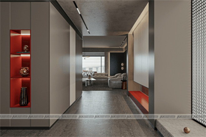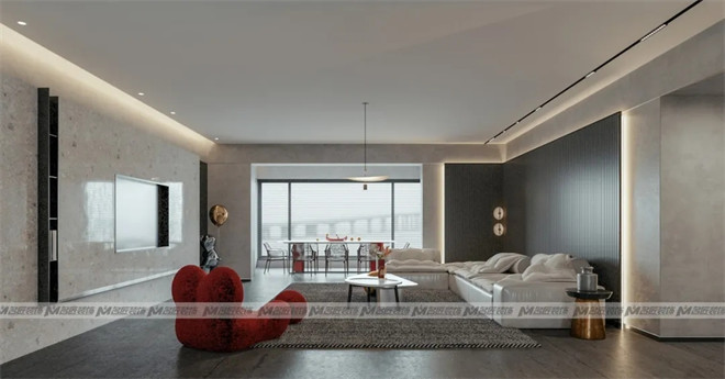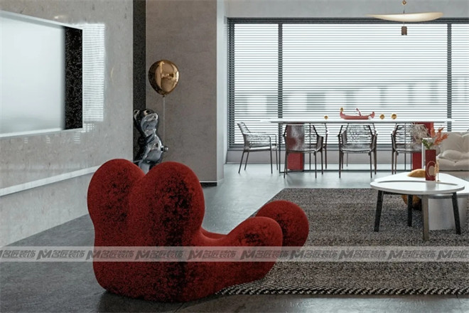 客廳與觀景陽臺(tái)相連,大面積的長虹紋玻璃墻,帶來良好的采光,延伸視覺效果,擴(kuò)大空間感。再添入一抹朱紅,驚艷了時(shí)光。