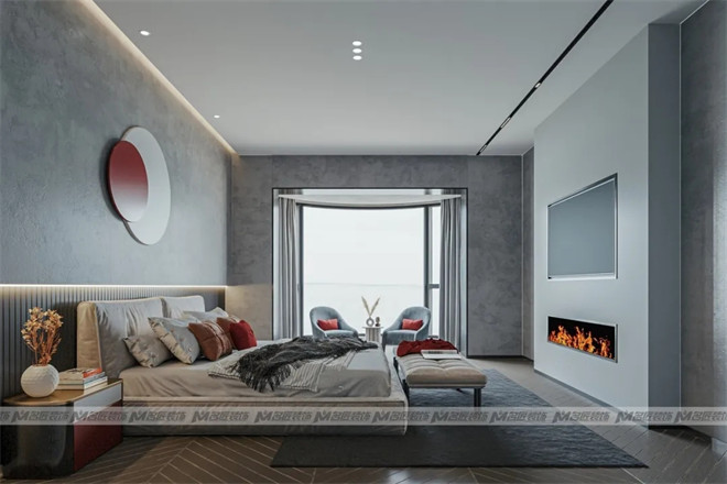 主臥以高級(jí)灰作為肌底,純粹內(nèi)斂的質(zhì)感給予人情緒上的安撫,注入紅色軟裝,出現(xiàn)在裝飾畫、抱枕、床頭柜上,將張揚(yáng)與低調(diào)銜接和諧,凸顯優(yōu)雅格調(diào)。