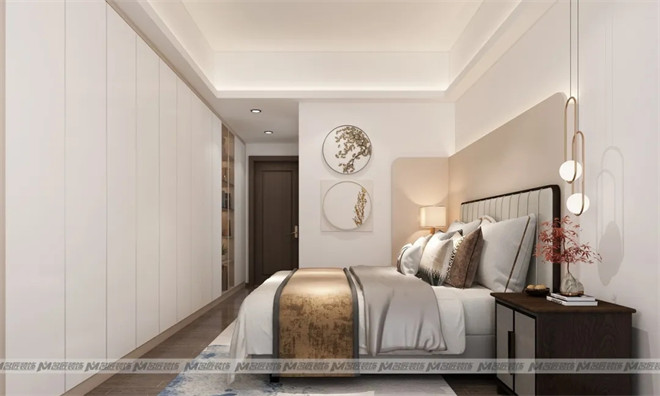 主臥的設計整體留白。嵌入式衣柜美觀實用,原木色和純白色的相遇,烘托出空間的溫潤,床頭墻用啞光烤漆木飾面作為裝飾,保持風格一致,與細膩的軟裝陳設交相呼應,予人入室的舒適愜意享受。