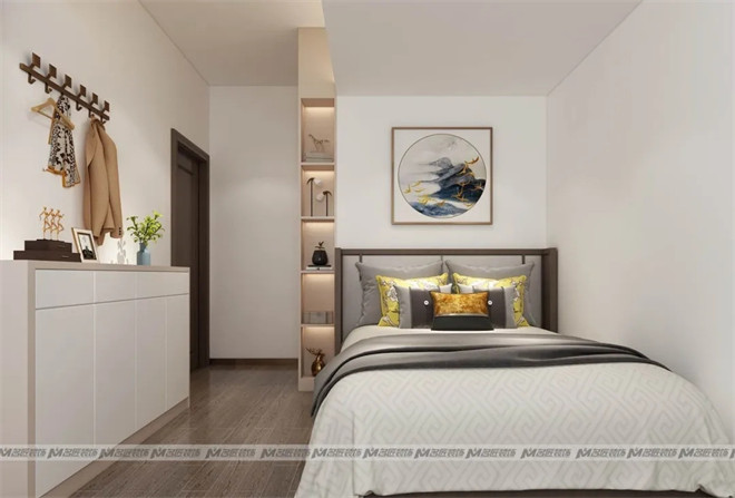 長輩房的設計延續(xù)整體風格的清幽淡雅,床頭墻掛著的飛鳥山水圖色彩鮮明大氣,與枕頭顏色協調照應,為素凈的居室環(huán)境帶來一絲靈動。
