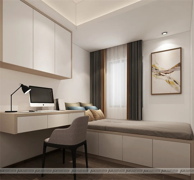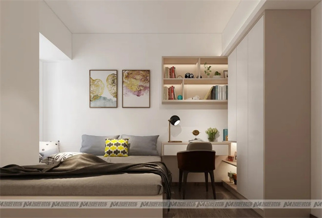 次臥的面積不大,設計師選用了衣柜書桌一體化功能設計,除了能夠節(jié)約空間,又滿足了工作、儲物等需求。