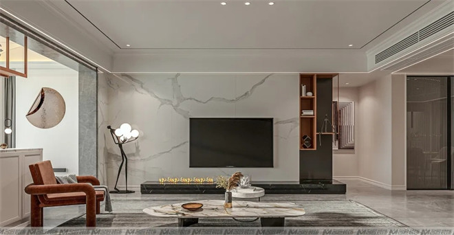 客廳空間簡潔大方,米灰色的布藝沙發(fā)散發(fā)著溫馨的味道,三色抱枕點綴其中,并與地毯、毛毯、單人椅的顏色相呼應,隨意又充滿設計感。大理石材質(zhì)的電視背景墻及茶幾,帶來輕奢質(zhì)感的視覺享受,提升空間的檔次。