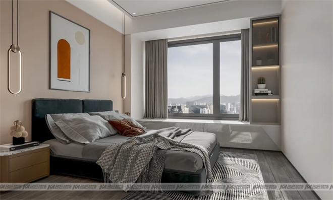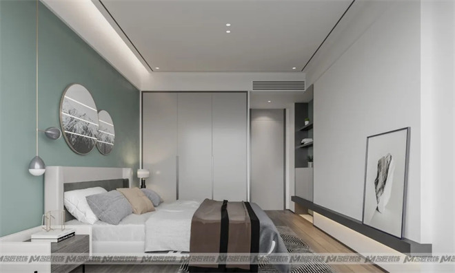 主臥的基調(diào)設計打破固化的審美觀,采用清新治愈的馬卡龍綠色作為床頭背景墻顏色,鋪上灰色木地板,裝點色彩和諧的吊燈、印象畫、掛畫等軟裝元素,鑲嵌上些許金邊,凸顯輕奢之美,簡潔而浪漫,這是心動的感覺!