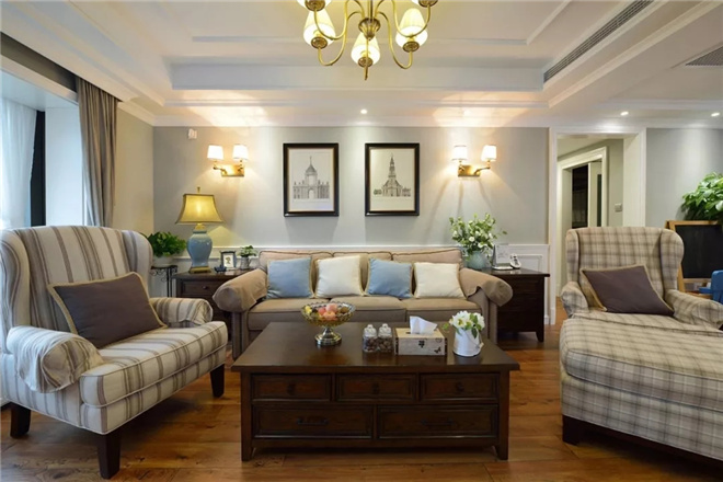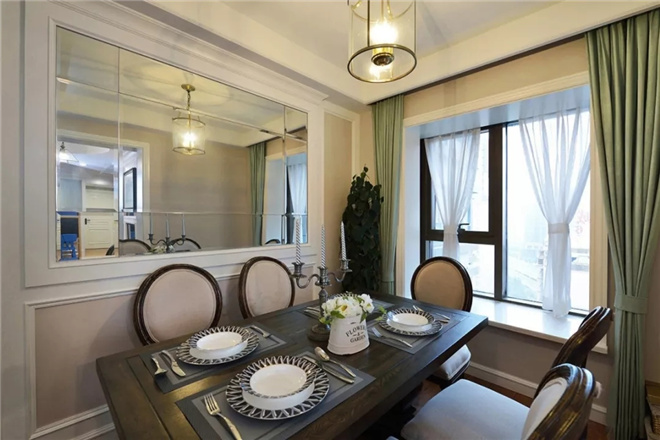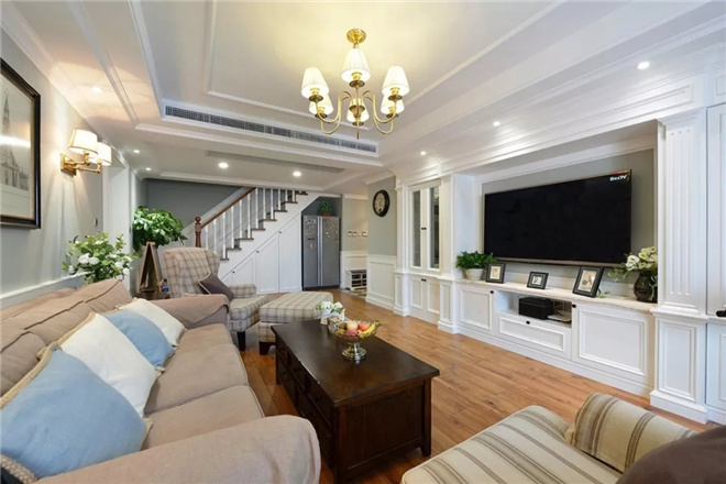 客廳色彩的選擇方面,其選擇了給人輕松作為空間色彩的基調(diào)。米藍(lán)色背景墻和純白色天花吊頂給人一種舒適感。有點復(fù)古的沙發(fā)與整個空間格外協(xié)調(diào)。除了沙發(fā)背景墻之外,電視背景墻采用美式簡歐風(fēng),石膏線條更能襯托美式獨有的風(fēng)情,在燈光的照射下,整個空間充滿浪漫十足味道。