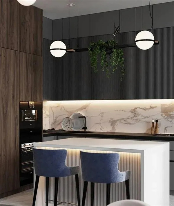 開放式廚房與客餐廳在視覺上連為一體,更加寬敞明亮。