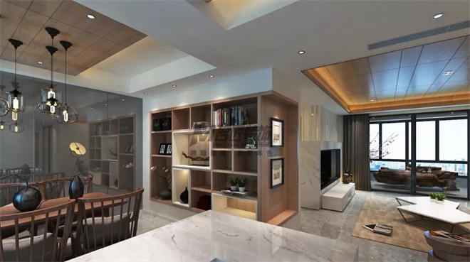 客廳與餐廳的銜接妙在用一組裝飾柜鑲嵌在墻的轉(zhuǎn)角處,擴大了過道面積又不失美觀。
