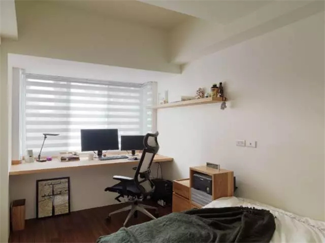 臥室的窗臺(tái)下,一個(gè)木質(zhì)擱板就成為簡(jiǎn)單的書(shū)桌,這種做法比放一個(gè)現(xiàn)成的桌子更加節(jié)省空間