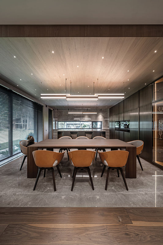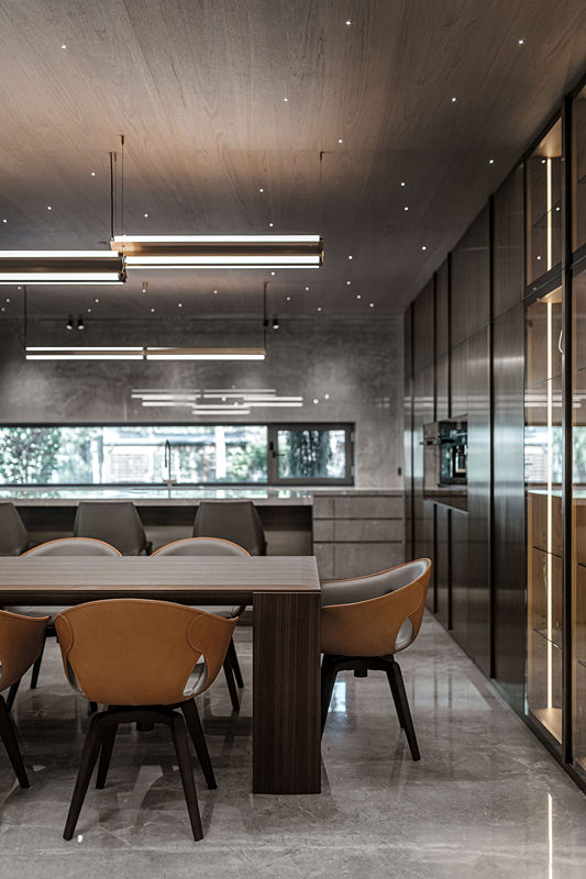 只見有無(wú)數(shù)柔和的光芒,像鉆石,又像星星,無(wú)序的點(diǎn)綴在木制天花上。美輪美奐,低調(diào)奢華,下方的就餐區(qū)與烹飪區(qū)開放融為一體,在動(dòng)人的“星光”下接受洗禮。