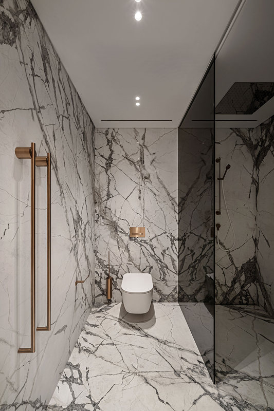 盥洗區(qū)的鏡子門后隱藏著“秘密空間”馬桶及淋浴區(qū),前面地面均以大理石裝飾,方便清理。內(nèi)嵌筒燈不占據(jù)空間,減少壓迫,同時(shí)又很好地營(yíng)造出溫馨感。