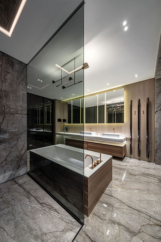 衛(wèi)浴的石材最終選擇了源自巴西高端進(jìn)口奢石——“巴塔哥尼亞”來(lái)奠定整體基調(diào)。其紋理粗獷、野性、生動(dòng),同時(shí)又具有極強(qiáng)的空間裝飾性。