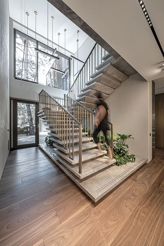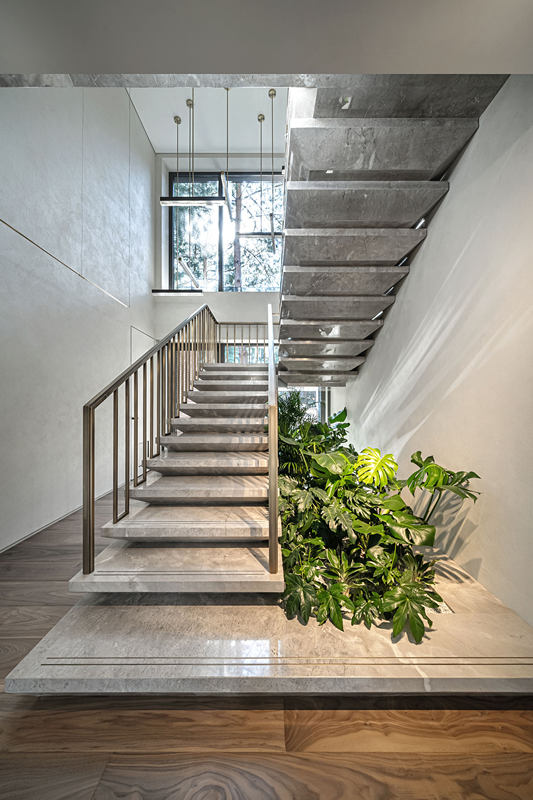 仿照梯田設(shè)計(jì)的樓梯蜿蜒而上,緩和平坦,走在上面十分具有安心感,下方的空地點(diǎn)綴上綠植,別有一番自然風(fēng)情。